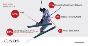 ◾ What they found was that the knee was the most affected part of the body and accounted for nearly double of all injuries sustained to the lower half of the body and a bit higher than a third of all injuries. ◾ A bit of good statistical news is that head injury, while being a hot frontier issue, declined. The data shows that only 5% of injuries that season were head related. ◾This might be due to an increased usage of helmets ⛑️, but as we have discovered in other SnowBrains articles on head trauma, conflicting evidence supports that helmets may not be as effective as we think. Also, it is hard to quantify head injuries as sometimes concussions are very hard to diagnose. 📚 Statistics on Skiing Injuries 2015 Based on Claims Data from SOS. Website .https://www.sos.eu. 12/19/2016.